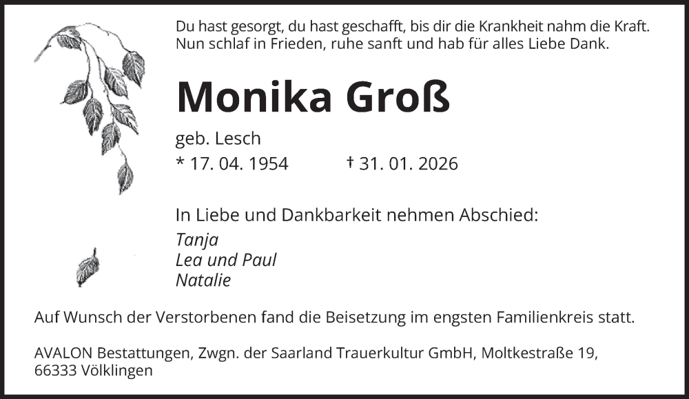 Hier finden Sie alle Traueranzeigen aus der Zeitung, die bisher für Monika Groß erschienen sind. Weitere Traueranzeigen, die in der Zeitung erscheinen, werden hier ebenfalls aufgelistet