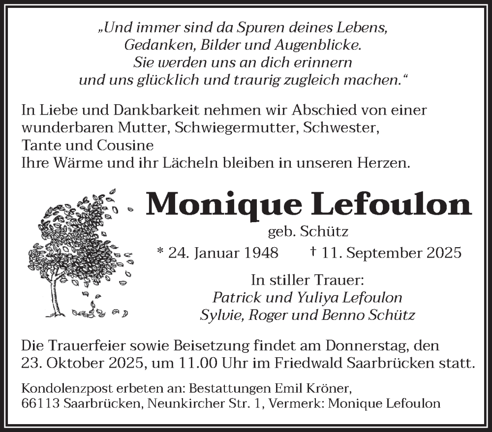 Hier finden Sie alle Traueranzeigen aus der Zeitung, die bisher für Monique Lefoulon erschienen sind. Weitere Traueranzeigen, die in der Zeitung erscheinen, werden hier ebenfalls aufgelistet
