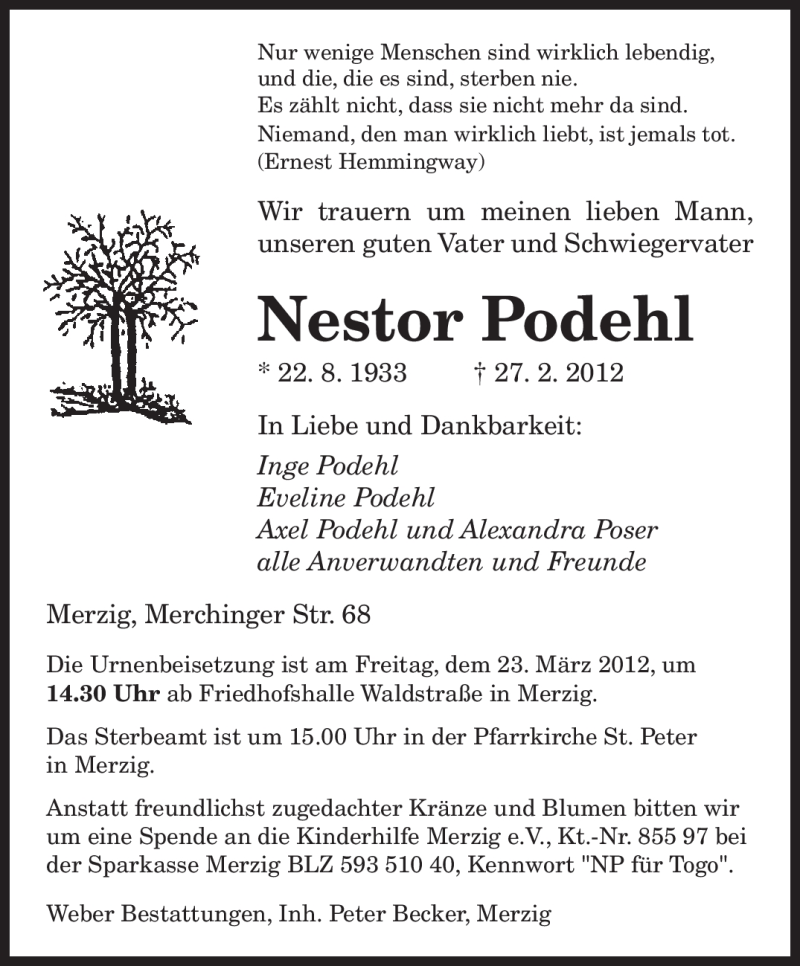 Hier finden Sie alle Traueranzeigen aus der Zeitung, die bisher für Nestor Podehl erschienen sind. Weitere Traueranzeigen, die in der Zeitung erscheinen, werden hier ebenfalls aufgelistet