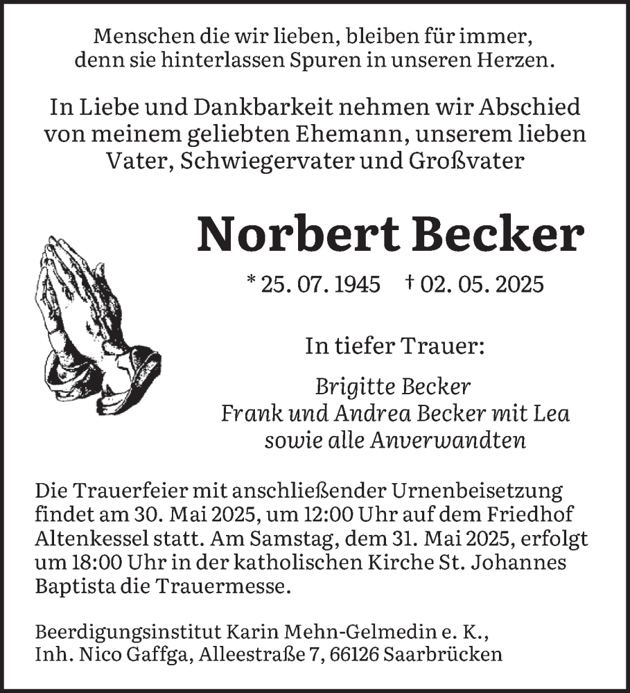 Hier finden Sie alle Traueranzeigen aus der Zeitung, die bisher für Norbert Becker erschienen sind. Weitere Traueranzeigen, die in der Zeitung erscheinen, werden hier ebenfalls aufgelistet