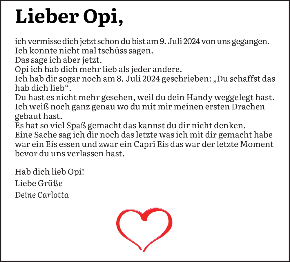 Hier finden Sie alle Traueranzeigen aus der Zeitung, die bisher für Opi erschienen sind. Weitere Traueranzeigen, die in der Zeitung erscheinen, werden hier ebenfalls aufgelistet