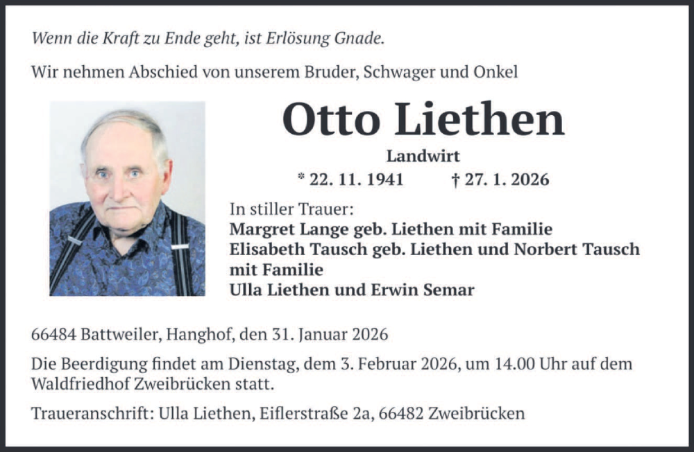 Hier finden Sie alle Traueranzeigen aus der Zeitung, die bisher für Otto Liethen erschienen sind. Weitere Traueranzeigen, die in der Zeitung erscheinen, werden hier ebenfalls aufgelistet