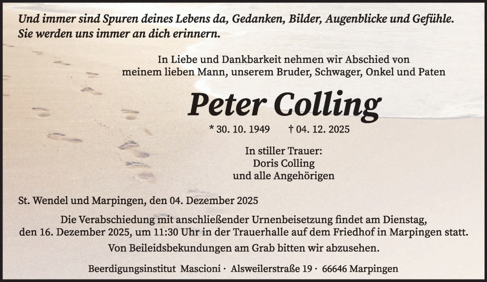 Hier finden Sie alle Traueranzeigen aus der Zeitung, die bisher für Peter Colling erschienen sind. Weitere Traueranzeigen, die in der Zeitung erscheinen, werden hier ebenfalls aufgelistet