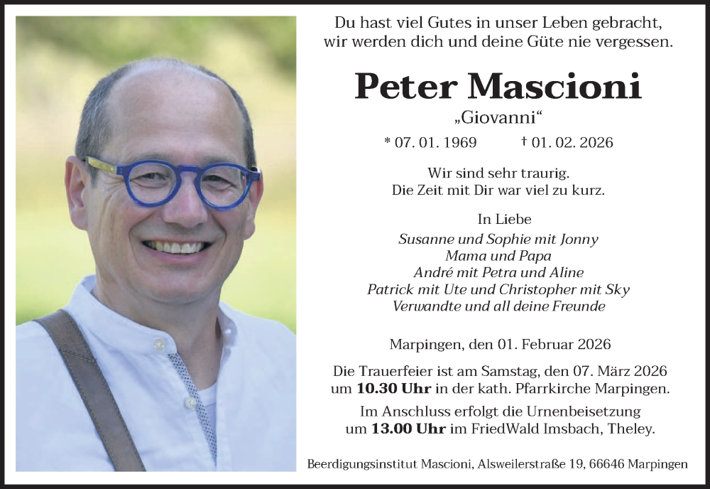 Hier finden Sie alle Traueranzeigen aus der Zeitung, die bisher für Peter Mascioni erschienen sind. Weitere Traueranzeigen, die in der Zeitung erscheinen, werden hier ebenfalls aufgelistet