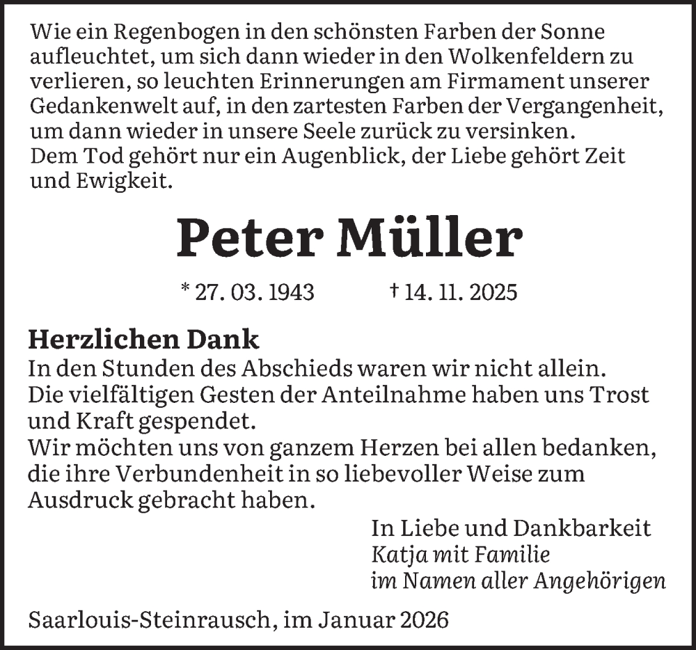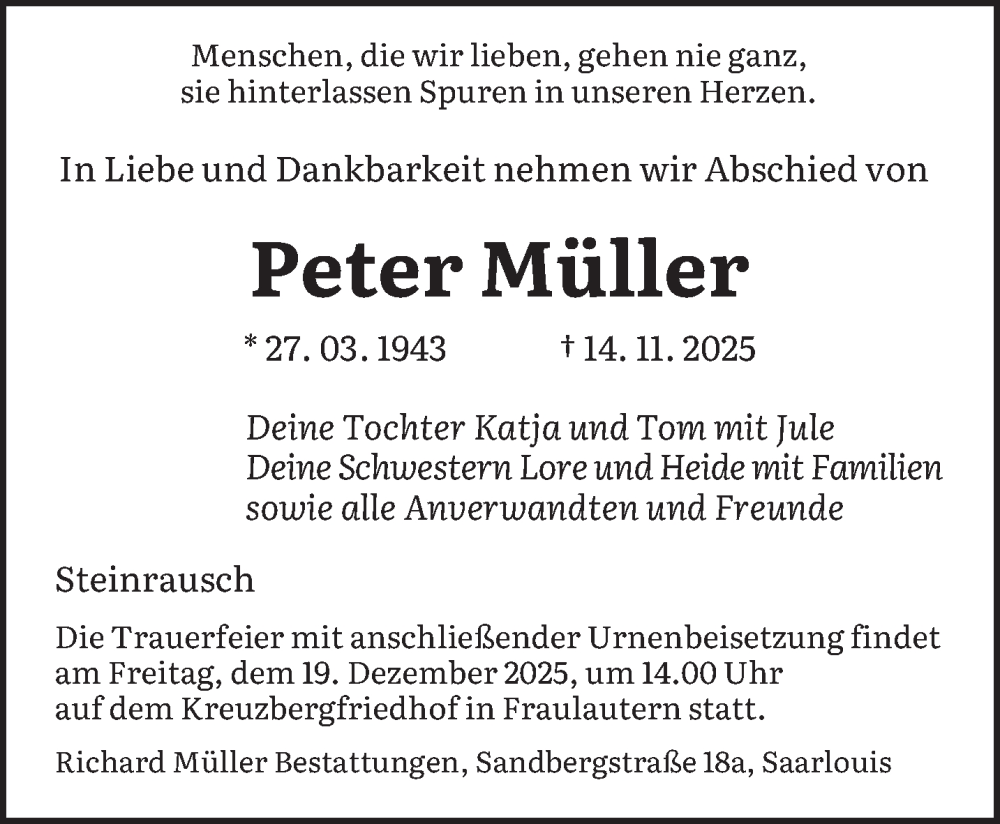 Hier finden Sie alle Traueranzeigen aus der Zeitung, die bisher für Peter Müller erschienen sind. Weitere Traueranzeigen, die in der Zeitung erscheinen, werden hier ebenfalls aufgelistet
