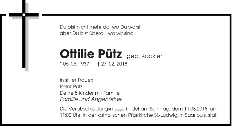 Hier finden Sie alle Traueranzeigen aus der Zeitung, die bisher für Peter Pütz erschienen sind. Weitere Traueranzeigen, die in der Zeitung erscheinen, werden hier ebenfalls aufgelistet