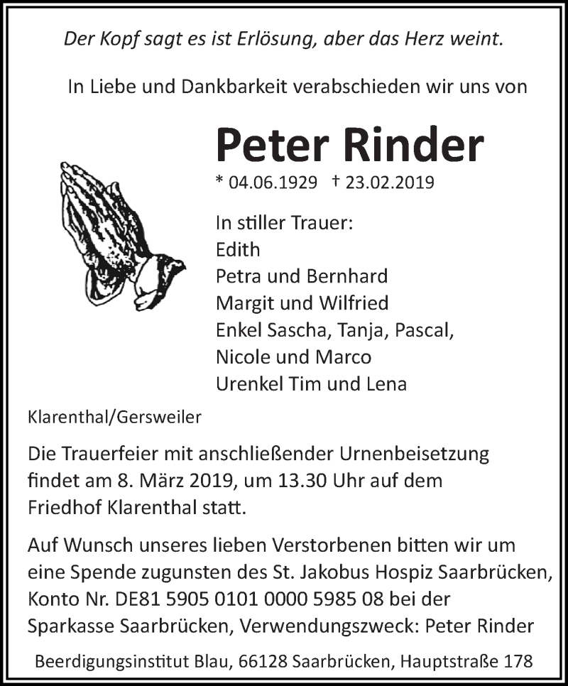 Hier finden Sie alle Traueranzeigen aus der Zeitung, die bisher für Peter Rinder erschienen sind. Weitere Traueranzeigen, die in der Zeitung erscheinen, werden hier ebenfalls aufgelistet
