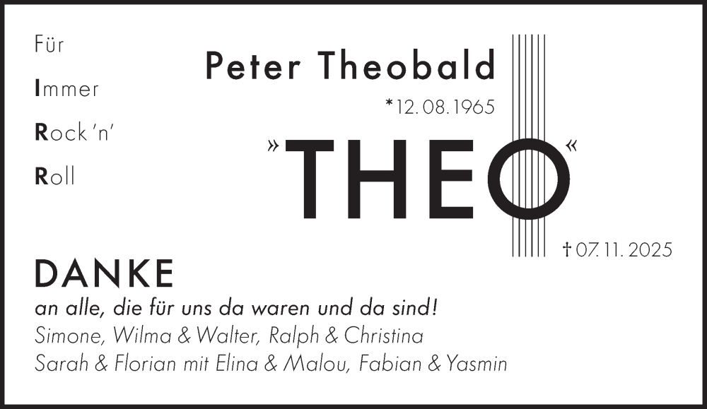 Hier finden Sie alle Traueranzeigen aus der Zeitung, die bisher für Peter Theobald erschienen sind. Weitere Traueranzeigen, die in der Zeitung erscheinen, werden hier ebenfalls aufgelistet