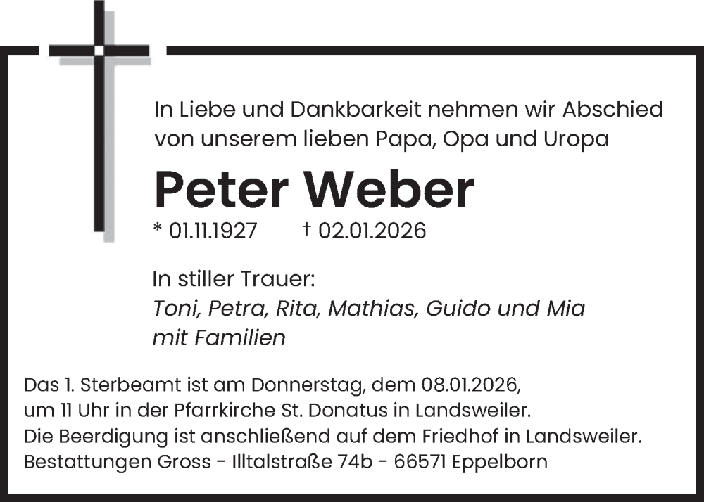 Hier finden Sie alle Traueranzeigen aus der Zeitung, die bisher für Peter Weber erschienen sind. Weitere Traueranzeigen, die in der Zeitung erscheinen, werden hier ebenfalls aufgelistet