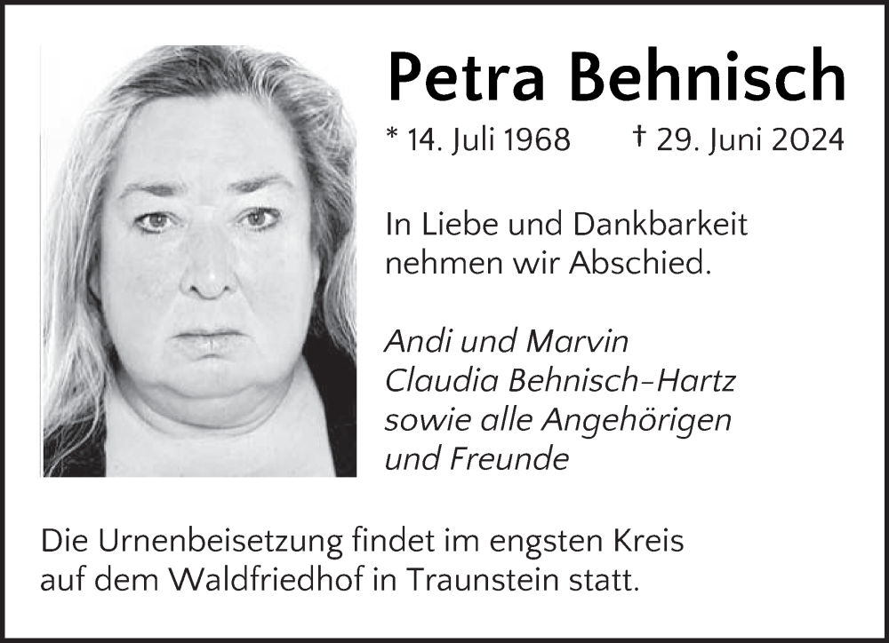 Hier finden Sie alle Traueranzeigen aus der Zeitung, die bisher für Petra Behnisch erschienen sind. Weitere Traueranzeigen, die in der Zeitung erscheinen, werden hier ebenfalls aufgelistet