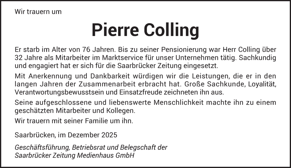 Hier finden Sie alle Traueranzeigen aus der Zeitung, die bisher für Pierre Colling erschienen sind. Weitere Traueranzeigen, die in der Zeitung erscheinen, werden hier ebenfalls aufgelistet