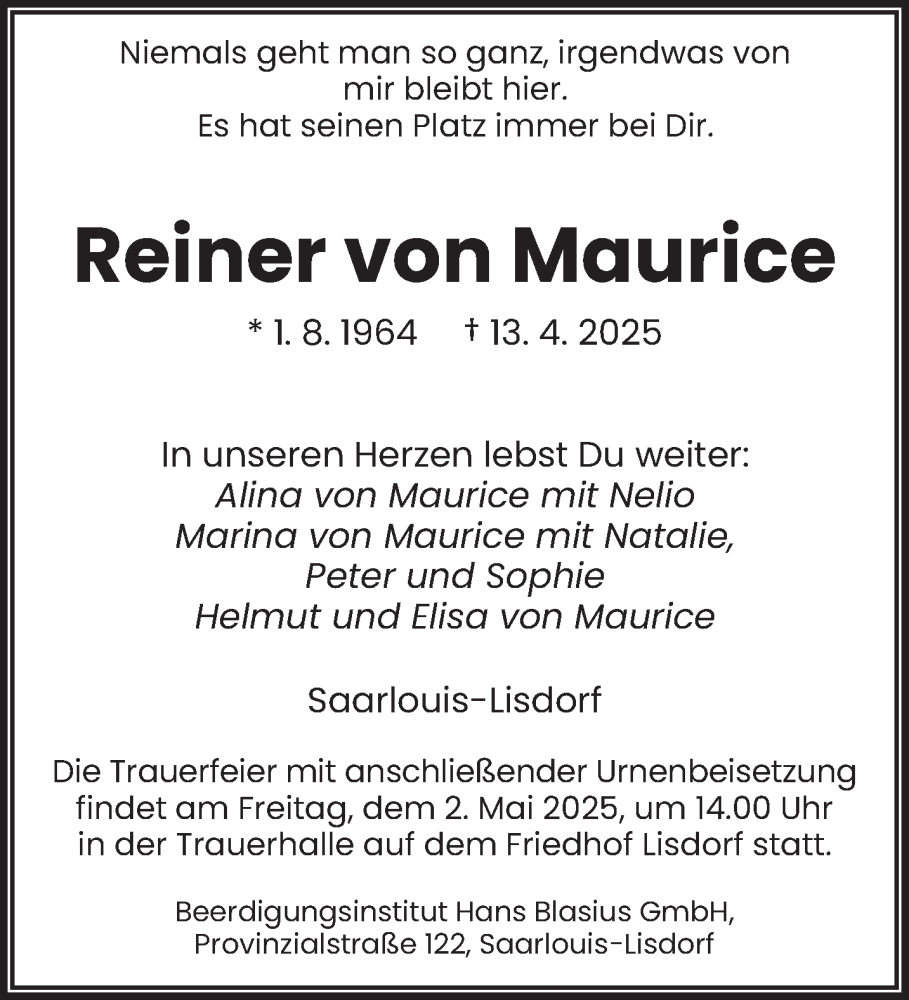 Hier finden Sie alle Traueranzeigen aus der Zeitung, die bisher für Reiner von Maurice erschienen sind. Weitere Traueranzeigen, die in der Zeitung erscheinen, werden hier ebenfalls aufgelistet