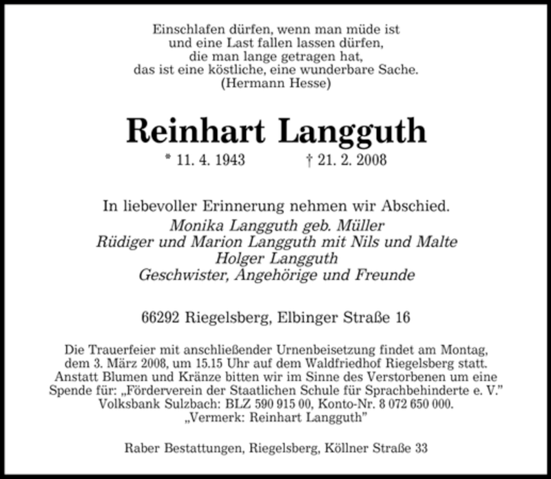 Hier finden Sie alle Traueranzeigen aus der Zeitung, die bisher für Reinhart Langguth erschienen sind. Weitere Traueranzeigen, die in der Zeitung erscheinen, werden hier ebenfalls aufgelistet