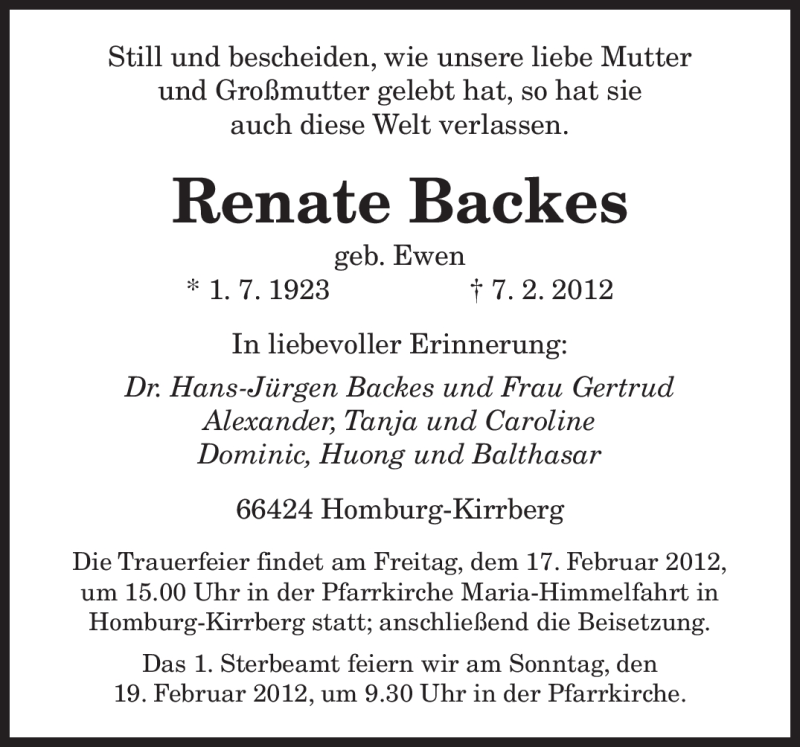 Hier finden Sie alle Traueranzeigen aus der Zeitung, die bisher für Renate Backes erschienen sind. Weitere Traueranzeigen, die in der Zeitung erscheinen, werden hier ebenfalls aufgelistet