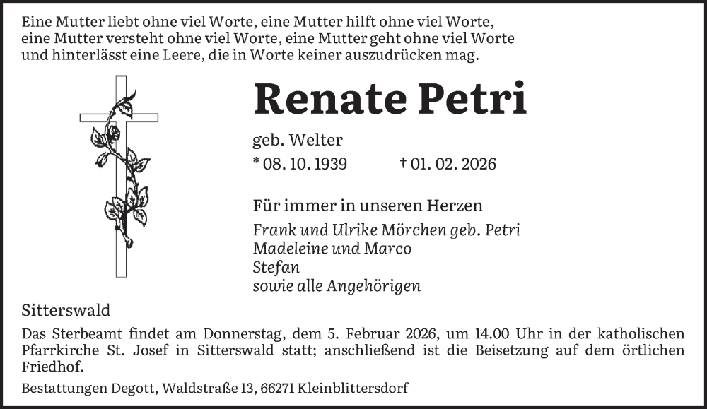 Hier finden Sie alle Traueranzeigen aus der Zeitung, die bisher für Renate Petri erschienen sind. Weitere Traueranzeigen, die in der Zeitung erscheinen, werden hier ebenfalls aufgelistet