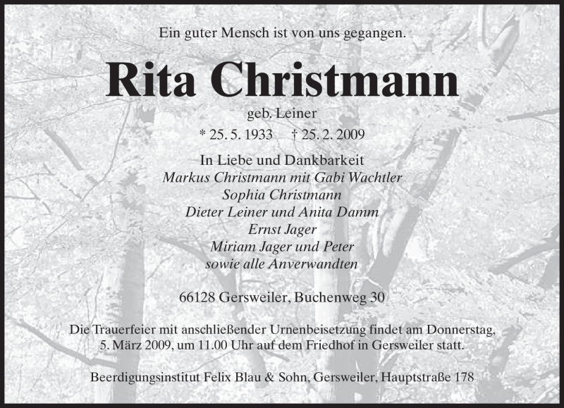 Hier finden Sie alle Traueranzeigen aus der Zeitung, die bisher für Rita Christmann erschienen sind. Weitere Traueranzeigen, die in der Zeitung erscheinen, werden hier ebenfalls aufgelistet