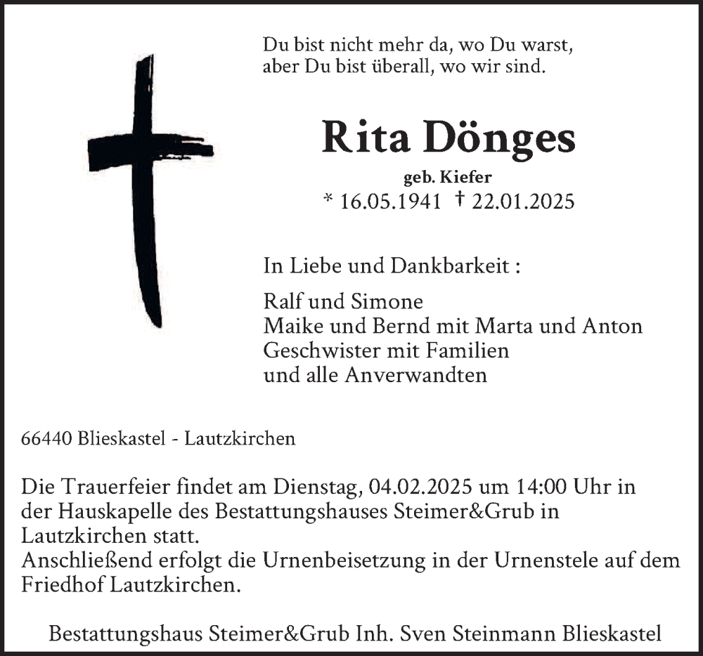 Hier finden Sie alle Traueranzeigen aus der Zeitung, die bisher für Rita Dönges erschienen sind. Weitere Traueranzeigen, die in der Zeitung erscheinen, werden hier ebenfalls aufgelistet
