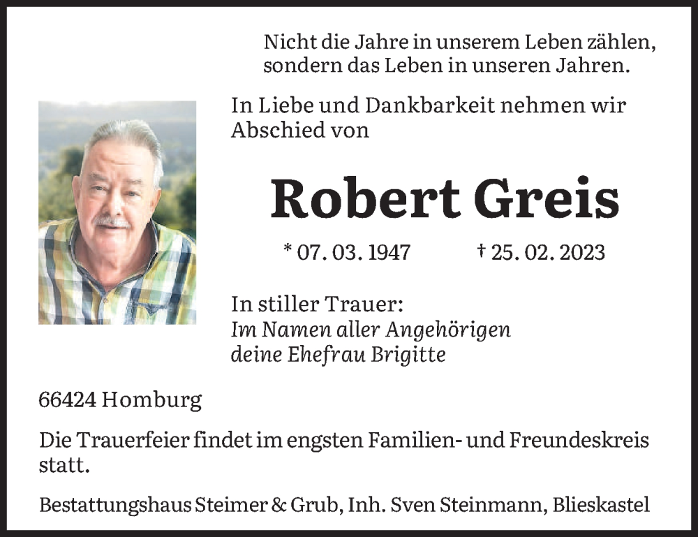 Hier finden Sie alle Traueranzeigen aus der Zeitung, die bisher für Robert Greis erschienen sind. Weitere Traueranzeigen, die in der Zeitung erscheinen, werden hier ebenfalls aufgelistet