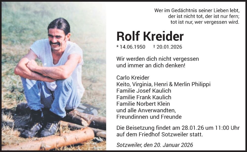 Hier finden Sie alle Traueranzeigen aus der Zeitung, die bisher für Rolf Kreider erschienen sind. Weitere Traueranzeigen, die in der Zeitung erscheinen, werden hier ebenfalls aufgelistet