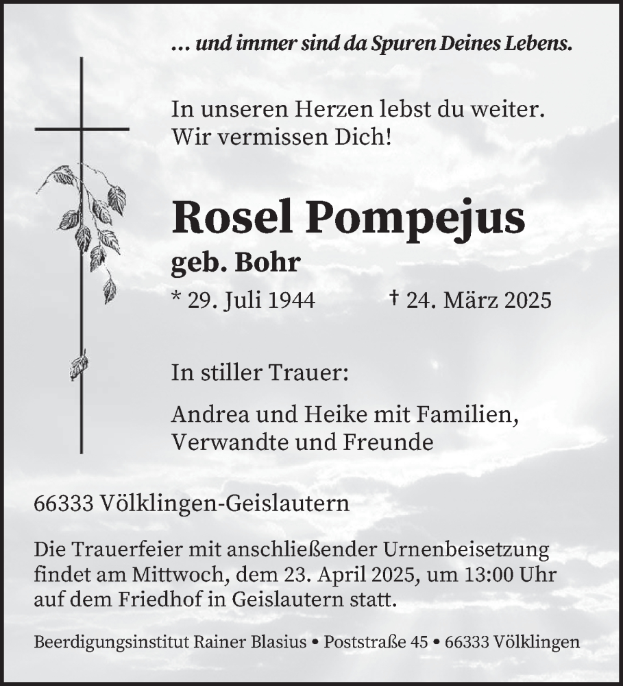 Hier finden Sie alle Traueranzeigen aus der Zeitung, die bisher für Rosel Pompejus erschienen sind. Weitere Traueranzeigen, die in der Zeitung erscheinen, werden hier ebenfalls aufgelistet