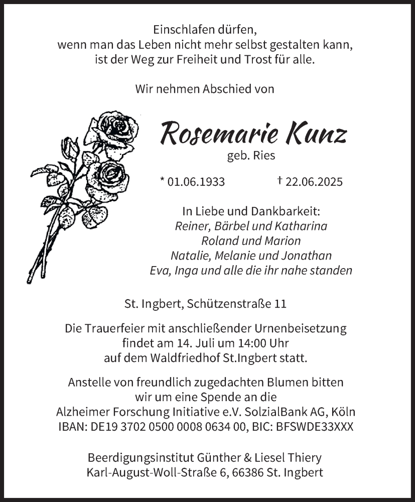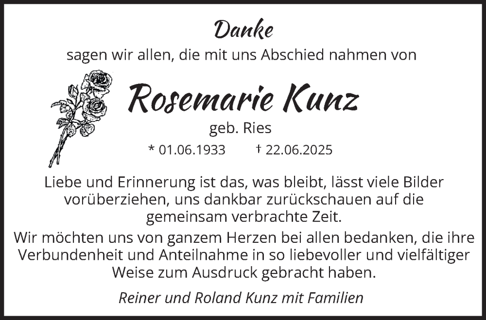 Hier finden Sie alle Traueranzeigen aus der Zeitung, die bisher für Rosemarie Kunz erschienen sind. Weitere Traueranzeigen, die in der Zeitung erscheinen, werden hier ebenfalls aufgelistet