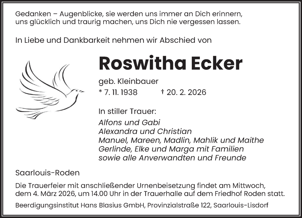 Hier finden Sie alle Traueranzeigen aus der Zeitung, die bisher für Roswitha Ecker erschienen sind. Weitere Traueranzeigen, die in der Zeitung erscheinen, werden hier ebenfalls aufgelistet