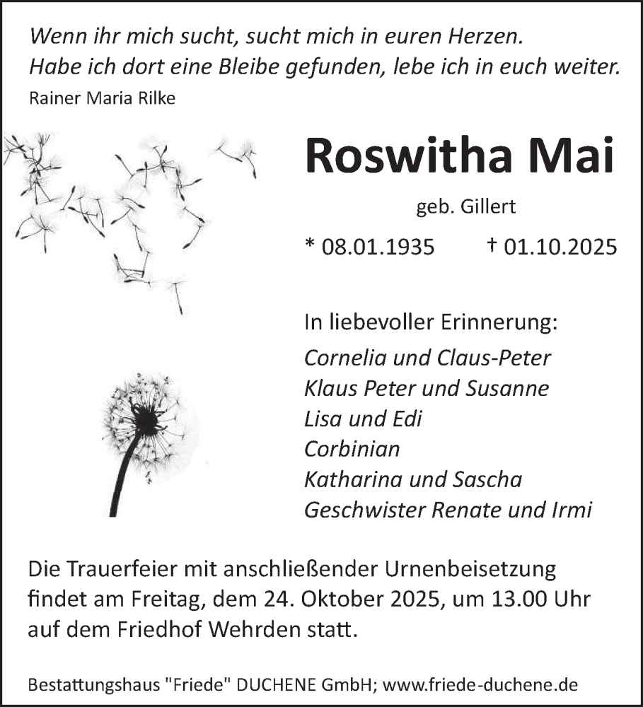 Hier finden Sie alle Traueranzeigen aus der Zeitung, die bisher für Roswitha Mai erschienen sind. Weitere Traueranzeigen, die in der Zeitung erscheinen, werden hier ebenfalls aufgelistet