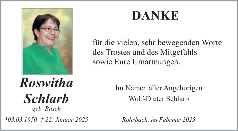 Hier finden Sie alle Traueranzeigen aus der Zeitung, die bisher für Roswitha Schlarb erschienen sind. Weitere Traueranzeigen, die in der Zeitung erscheinen, werden hier ebenfalls aufgelistet