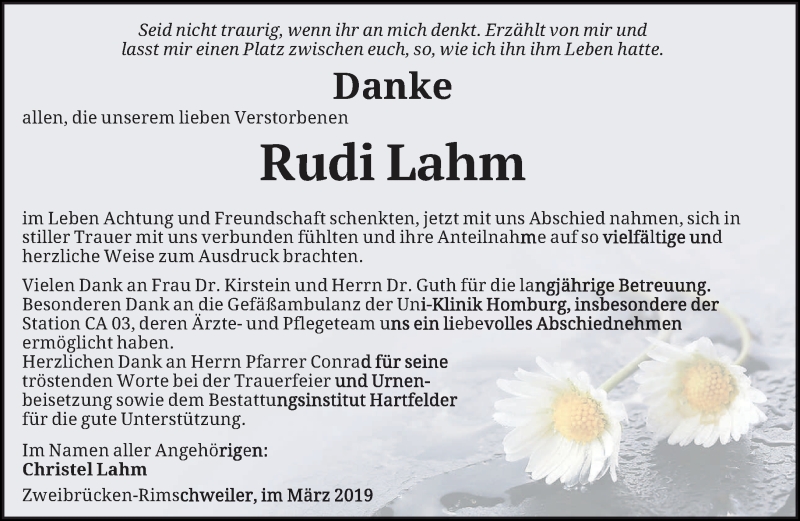 Hier finden Sie alle Traueranzeigen aus der Zeitung, die bisher für Rudi Lahm erschienen sind. Weitere Traueranzeigen, die in der Zeitung erscheinen, werden hier ebenfalls aufgelistet