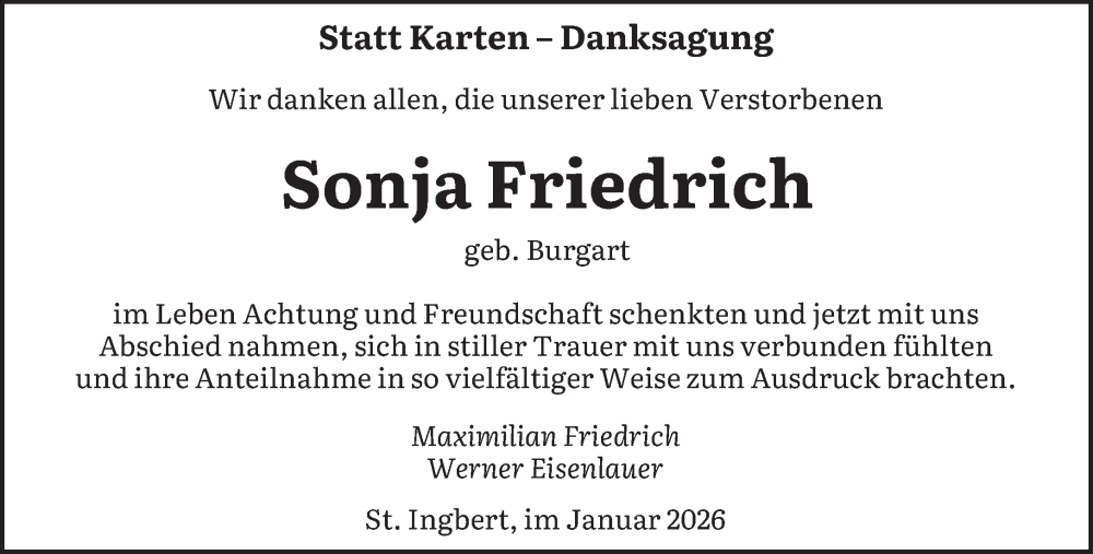 Hier finden Sie alle Traueranzeigen aus der Zeitung, die bisher für Sonja Friedrich erschienen sind. Weitere Traueranzeigen, die in der Zeitung erscheinen, werden hier ebenfalls aufgelistet