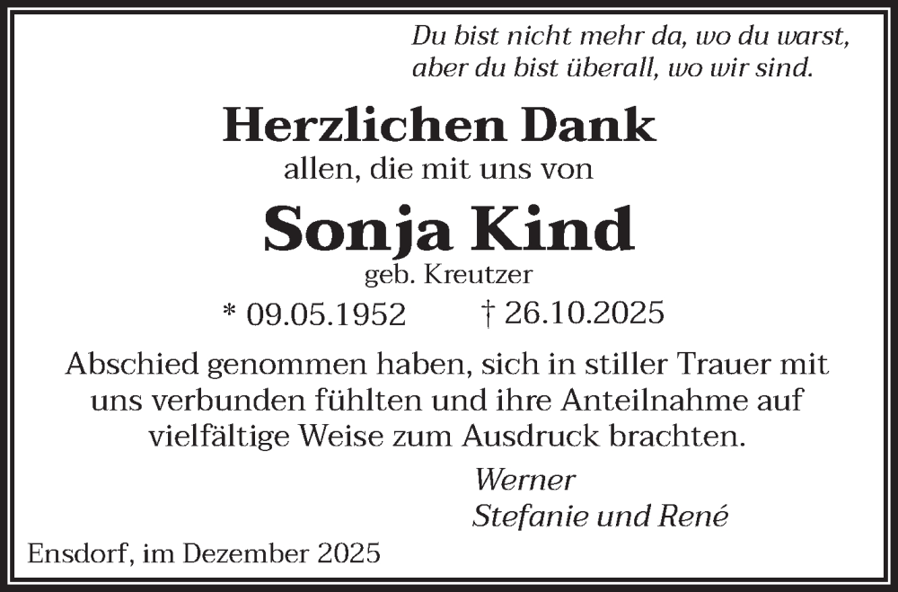 Hier finden Sie alle Traueranzeigen aus der Zeitung, die bisher für Sonja Kind erschienen sind. Weitere Traueranzeigen, die in der Zeitung erscheinen, werden hier ebenfalls aufgelistet