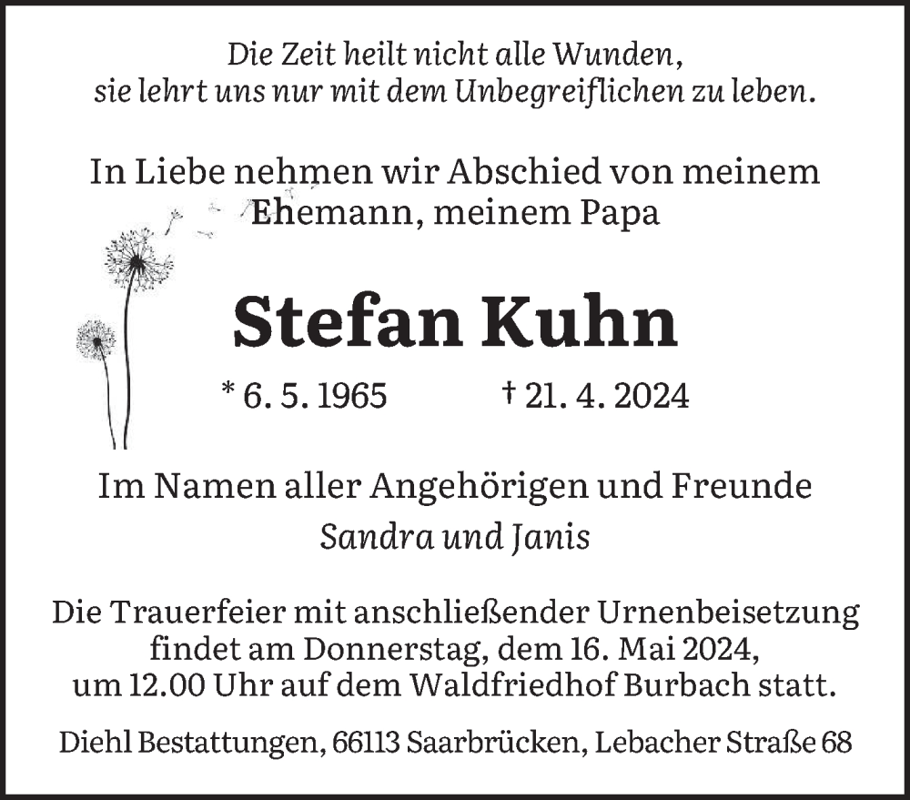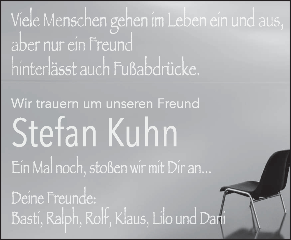 Hier finden Sie alle Traueranzeigen aus der Zeitung, die bisher für Stefan Kuhn erschienen sind. Weitere Traueranzeigen, die in der Zeitung erscheinen, werden hier ebenfalls aufgelistet