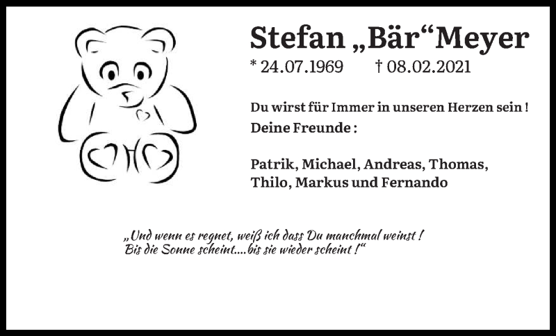 Hier finden Sie alle Traueranzeigen aus der Zeitung, die bisher für Stefan Meyer erschienen sind. Weitere Traueranzeigen, die in der Zeitung erscheinen, werden hier ebenfalls aufgelistet
