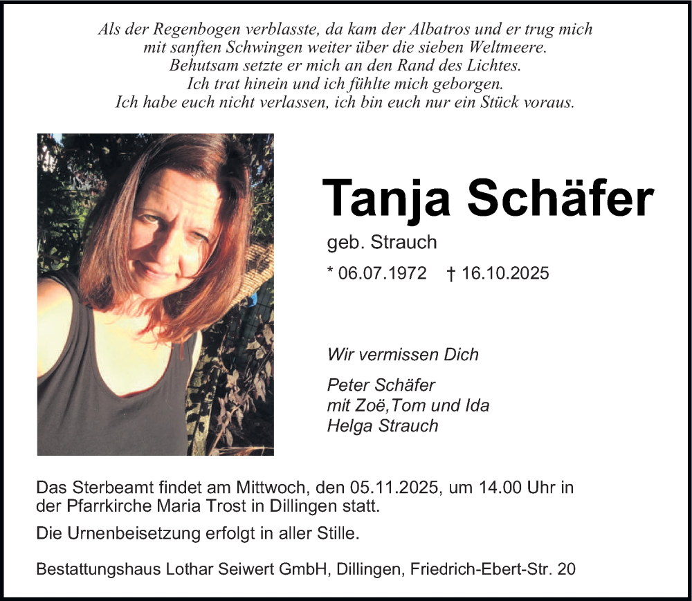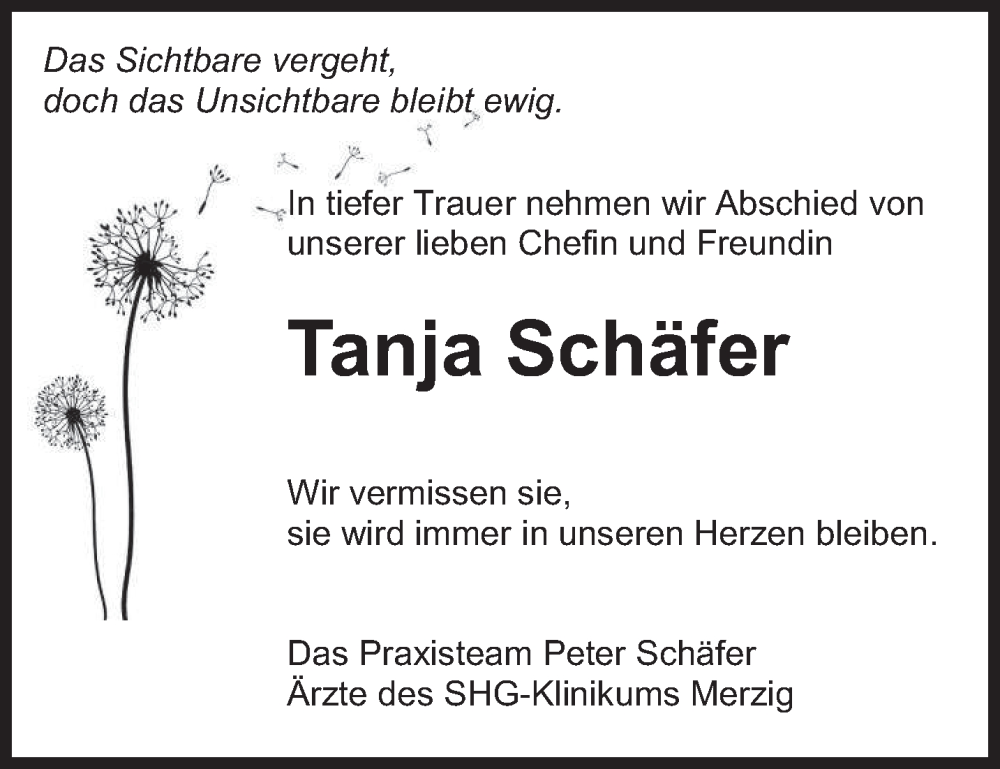 Hier finden Sie alle Traueranzeigen aus der Zeitung, die bisher für Tanja Schäfer erschienen sind. Weitere Traueranzeigen, die in der Zeitung erscheinen, werden hier ebenfalls aufgelistet