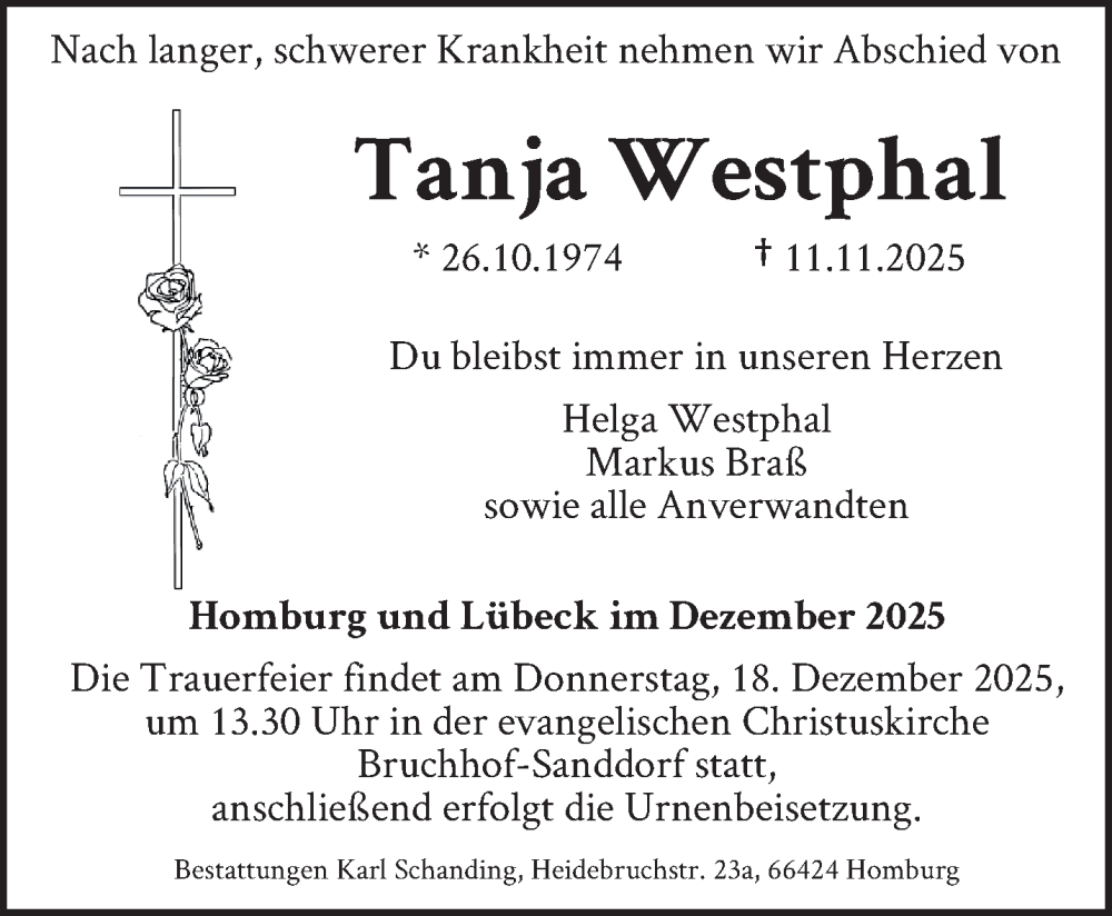 Hier finden Sie alle Traueranzeigen aus der Zeitung, die bisher für Tanja Westphal erschienen sind. Weitere Traueranzeigen, die in der Zeitung erscheinen, werden hier ebenfalls aufgelistet