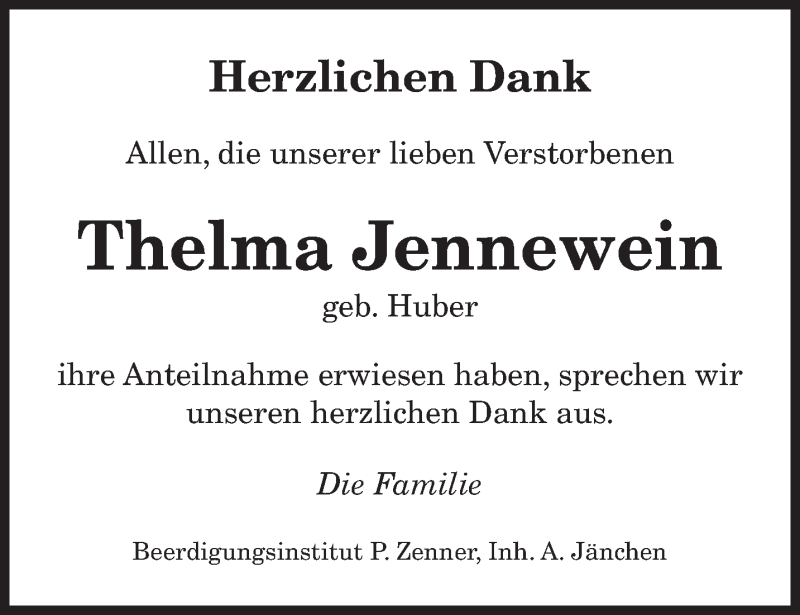 Hier finden Sie alle Traueranzeigen aus der Zeitung, die bisher für Thelma Jennewein erschienen sind. Weitere Traueranzeigen, die in der Zeitung erscheinen, werden hier ebenfalls aufgelistet
