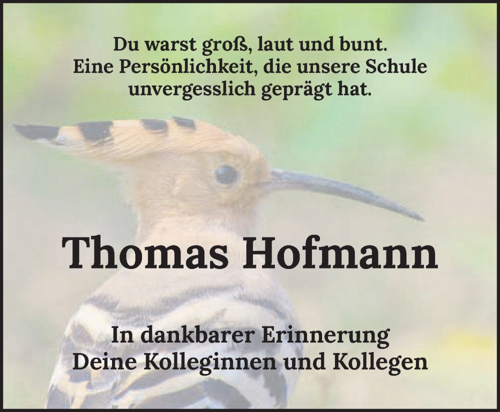 Hier finden Sie alle Traueranzeigen aus der Zeitung, die bisher für Thomas Hofmann erschienen sind. Weitere Traueranzeigen, die in der Zeitung erscheinen, werden hier ebenfalls aufgelistet