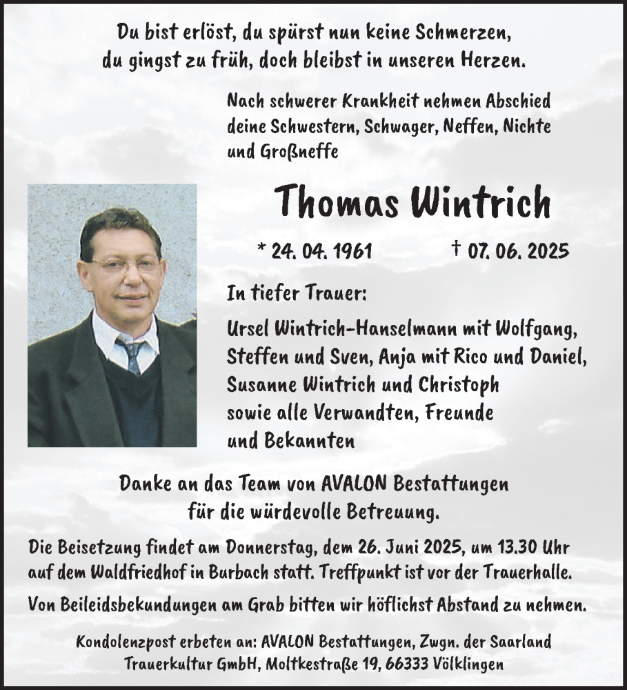 Hier finden Sie alle Traueranzeigen aus der Zeitung, die bisher für Thomas Wintrich erschienen sind. Weitere Traueranzeigen, die in der Zeitung erscheinen, werden hier ebenfalls aufgelistet