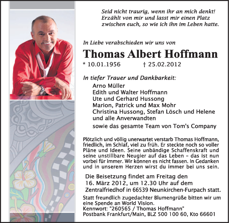Hier finden Sie alle Traueranzeigen aus der Zeitung, die bisher für Thomas Albert Hoffmann erschienen sind. Weitere Traueranzeigen, die in der Zeitung erscheinen, werden hier ebenfalls aufgelistet