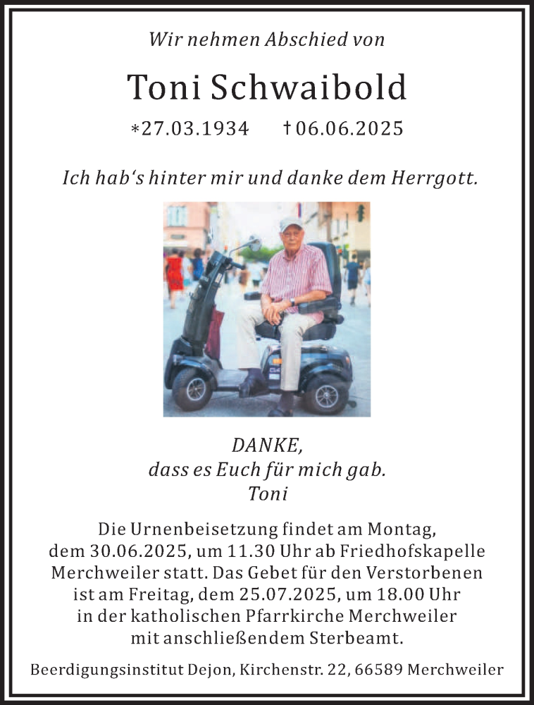 Hier finden Sie alle Traueranzeigen aus der Zeitung, die bisher für Toni Schwaibold erschienen sind. Weitere Traueranzeigen, die in der Zeitung erscheinen, werden hier ebenfalls aufgelistet