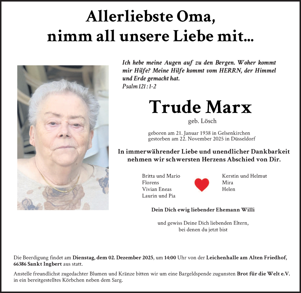 Hier finden Sie alle Traueranzeigen aus der Zeitung, die bisher für Trude Marx erschienen sind. Weitere Traueranzeigen, die in der Zeitung erscheinen, werden hier ebenfalls aufgelistet