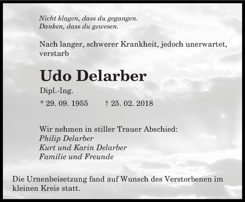 Hier finden Sie alle Traueranzeigen aus der Zeitung, die bisher für Udo Delarber erschienen sind. Weitere Traueranzeigen, die in der Zeitung erscheinen, werden hier ebenfalls aufgelistet