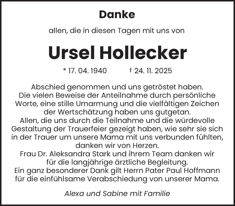 Hier finden Sie alle Traueranzeigen aus der Zeitung, die bisher für Ursel Hollecker erschienen sind. Weitere Traueranzeigen, die in der Zeitung erscheinen, werden hier ebenfalls aufgelistet