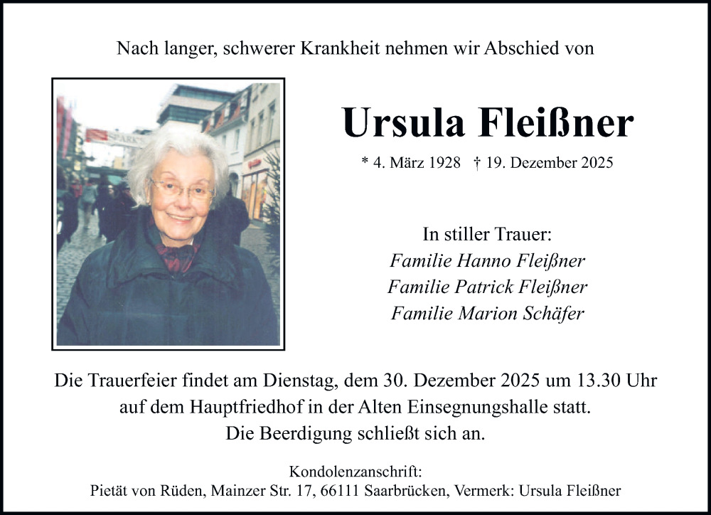 Hier finden Sie alle Traueranzeigen aus der Zeitung, die bisher für Ursula Fleißner erschienen sind. Weitere Traueranzeigen, die in der Zeitung erscheinen, werden hier ebenfalls aufgelistet