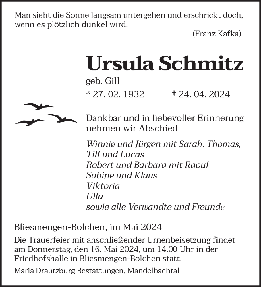 Hier finden Sie alle Traueranzeigen aus der Zeitung, die bisher für Ursula Schmitz erschienen sind. Weitere Traueranzeigen, die in der Zeitung erscheinen, werden hier ebenfalls aufgelistet