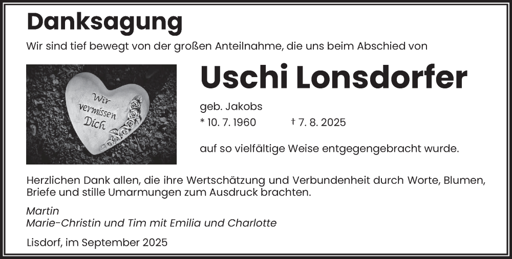 Hier finden Sie alle Traueranzeigen aus der Zeitung, die bisher für Uschi Lonsdorfer erschienen sind. Weitere Traueranzeigen, die in der Zeitung erscheinen, werden hier ebenfalls aufgelistet