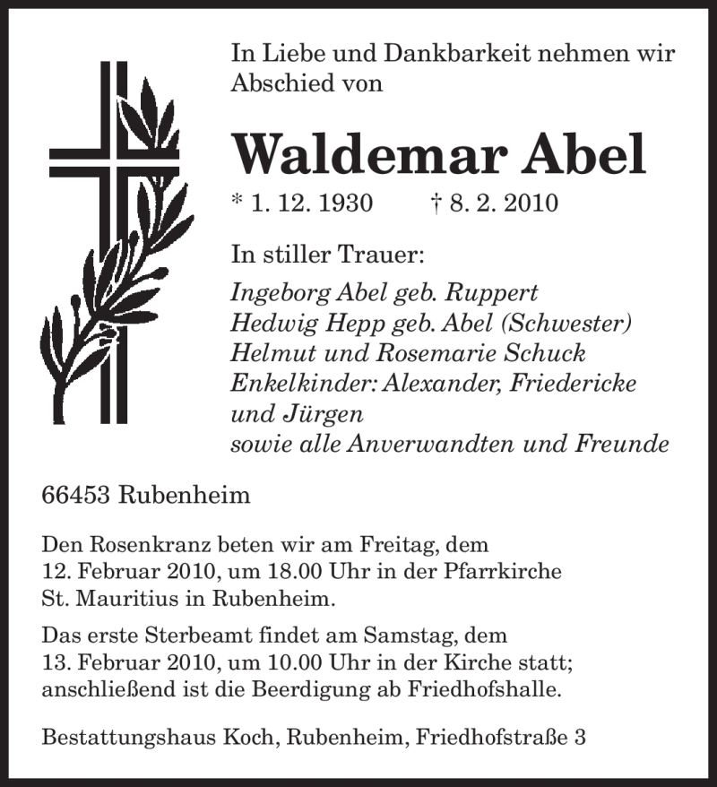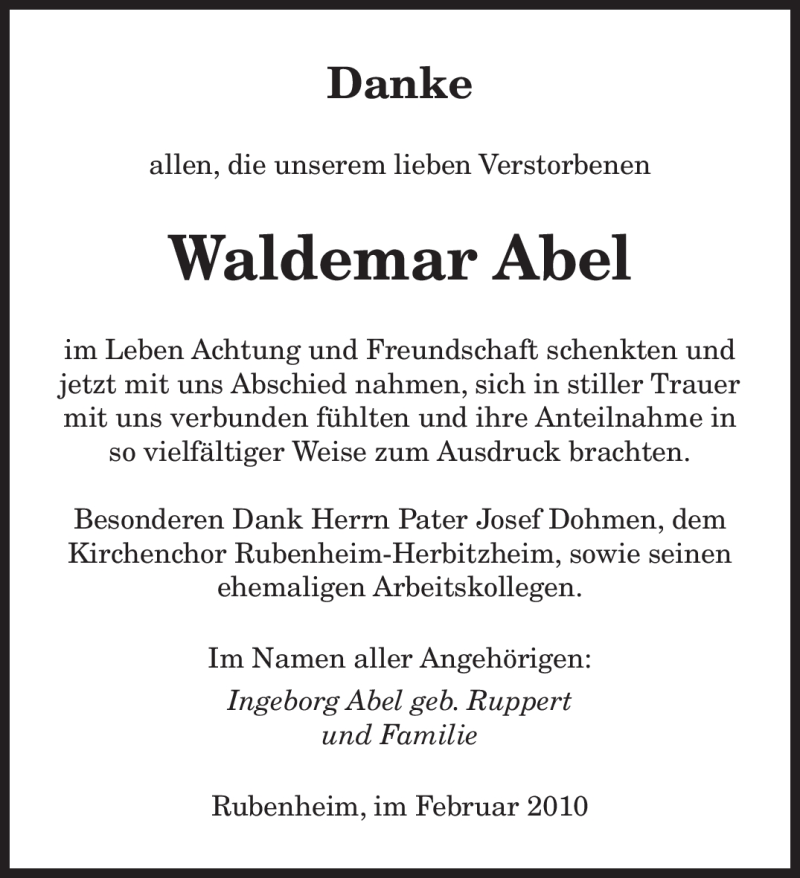 Hier finden Sie alle Traueranzeigen aus der Zeitung, die bisher für Waldemar Abel erschienen sind. Weitere Traueranzeigen, die in der Zeitung erscheinen, werden hier ebenfalls aufgelistet