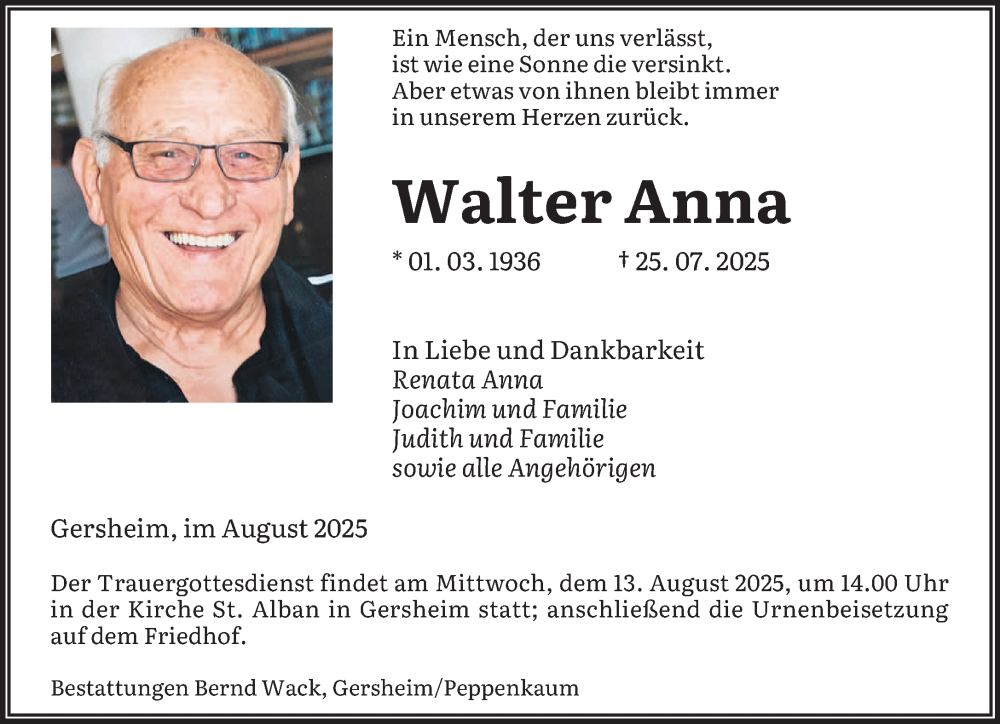 Hier finden Sie alle Traueranzeigen aus der Zeitung, die bisher für Walter Anna erschienen sind. Weitere Traueranzeigen, die in der Zeitung erscheinen, werden hier ebenfalls aufgelistet
