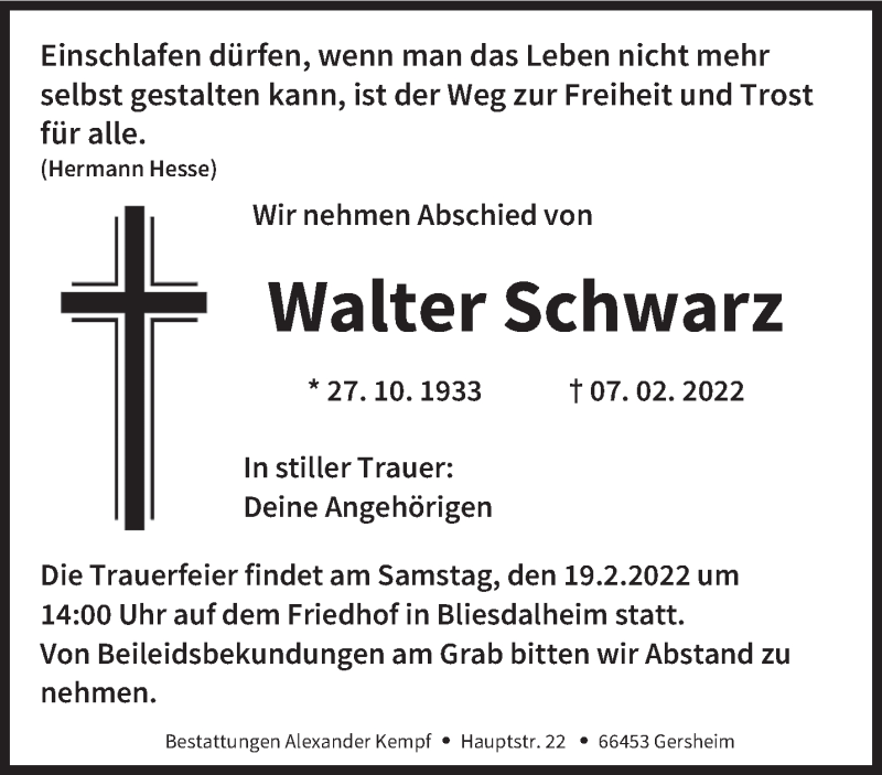 Hier finden Sie alle Traueranzeigen aus der Zeitung, die bisher für Walter Schwarz erschienen sind. Weitere Traueranzeigen, die in der Zeitung erscheinen, werden hier ebenfalls aufgelistet