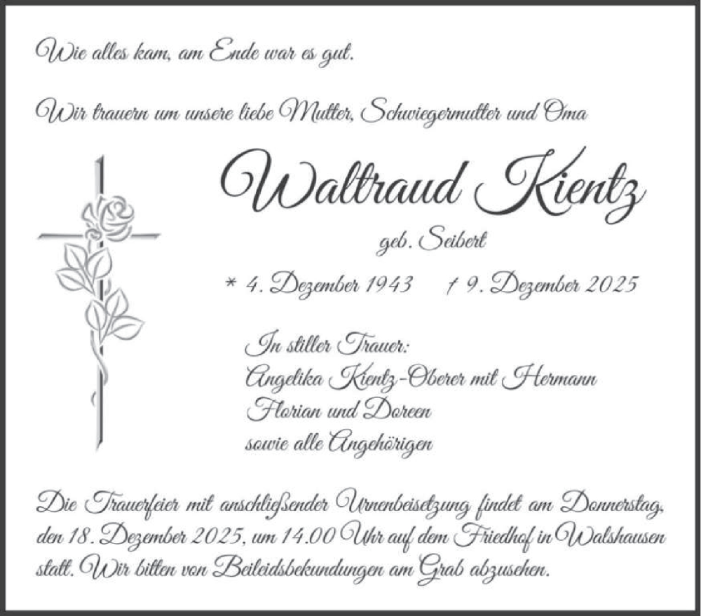Hier finden Sie alle Traueranzeigen aus der Zeitung, die bisher für Waltraud Kientz erschienen sind. Weitere Traueranzeigen, die in der Zeitung erscheinen, werden hier ebenfalls aufgelistet